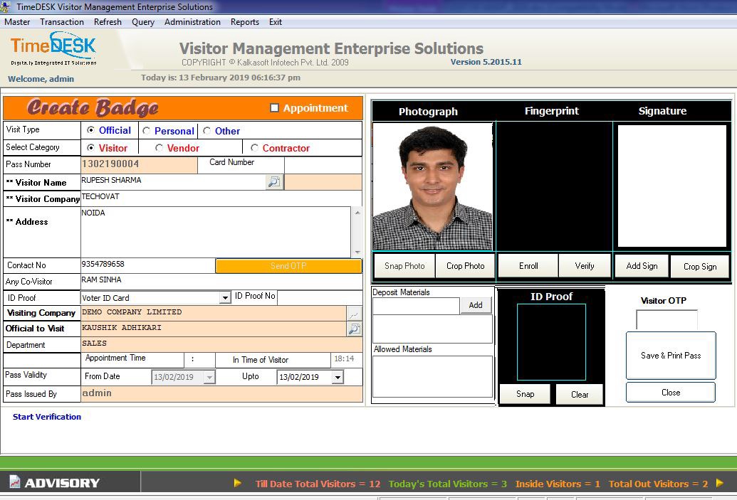 Upon arrival of visitor, the same is checked by the reception and pass is generated.